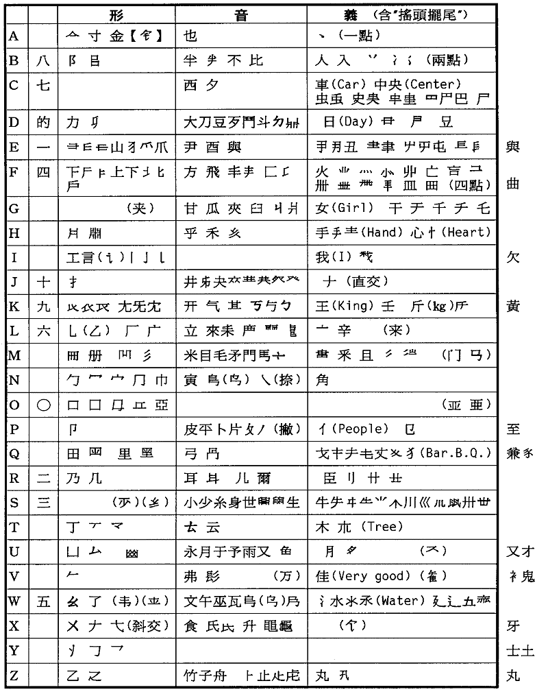 即使一個字本身就是「字根」,也都一定要再補一個根,不能單獨只取字根的碼。 若數目字不做單獨的數字使用時,就要恢復常態。 ★ 此教學說明舉凡所有例字皆以版本 5.5 版為主,因版本的差別,所以可能造成一碼字及所對應字母的之不同。 |